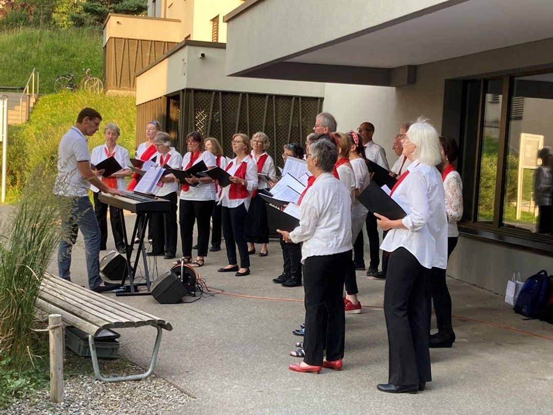 Der Sommeranfang wird in Urdorf traditionell vom Ad hoc-Chor "angesungen". Dazu waren wir, nicht lange nach unserer Teilnahme an der langen Nacht der Kirchen, am 16.6.2025, zu Gast in der Genossenschaftssiedlung "Im Heidenkeller". In deren Zentrum befindet sich neben dem Spielplatz ein idealer Platz für gemeinschaftliche Aktivitäten. Dort waren von freundlichen Unterstützern für diesen schönen Sommerabend bereits Tische und Bänke bereitgestellt; diese dienten nicht nur den Zuhörern als Sitzplatz sondern nach dem Programm auch für das muntere Beisammensein beim Apéro. Wir bedanken uns bei der Gemeinschaft im Heidenkeller für diese Unterstützung und das Offerieren der Getränke zum Apéro und haben uns über die zahlreichen Zuhörer sehr gefreut. Unser Programm umfasste zwei Liebeslieder, eines davon ein indianisches Volkslied; danach ein altes Protestlied von Joan Baez, aber auch leichtere Kost wie "die kleine Konditorei" und "Du passt so gut zu mir". Mit dem irischen Segen, als kleinen Hinweis für die kommende Ferienzeit und einer Zugabe nach reichlichem Beifall, beendeten wir den musikalischen Teil des Abends. Der angenehme Sommerabend , der Apéro und die vielen guten Gespräche luden zum Bleiben bis in den Abend hinein ein.